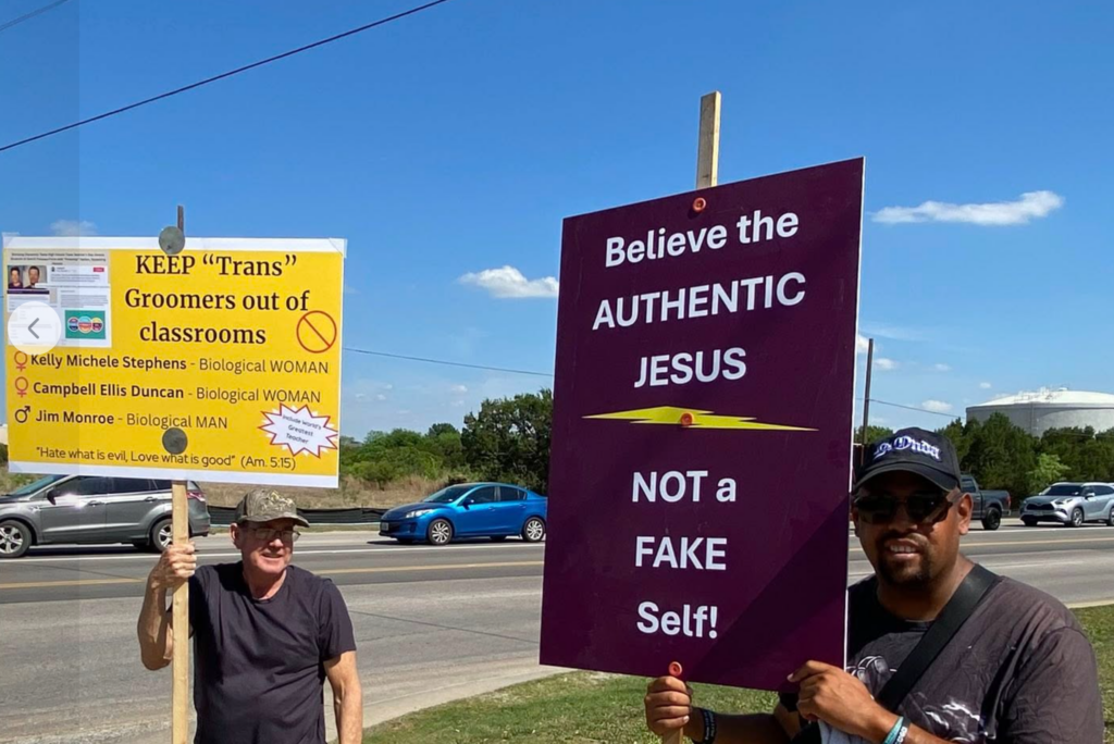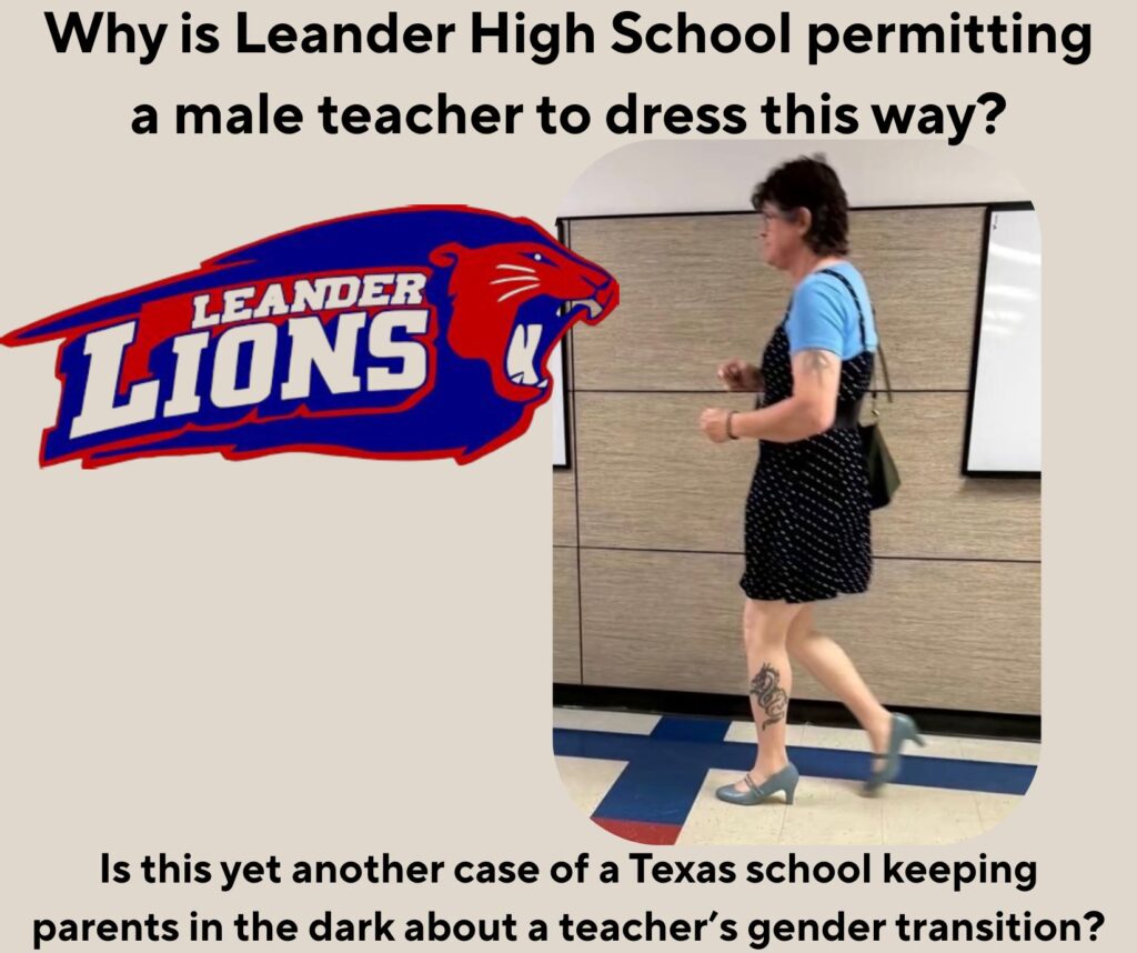 When classes dismissed on Monday afternoon, around eight adult protesters greeted vehicles and pedestrians leaving for the day. At issue for the picketers: three Leander High School teachers documented wearing clothing of the opposite sex while teaching class and flaunting their sexual identity opinions into the classroom.